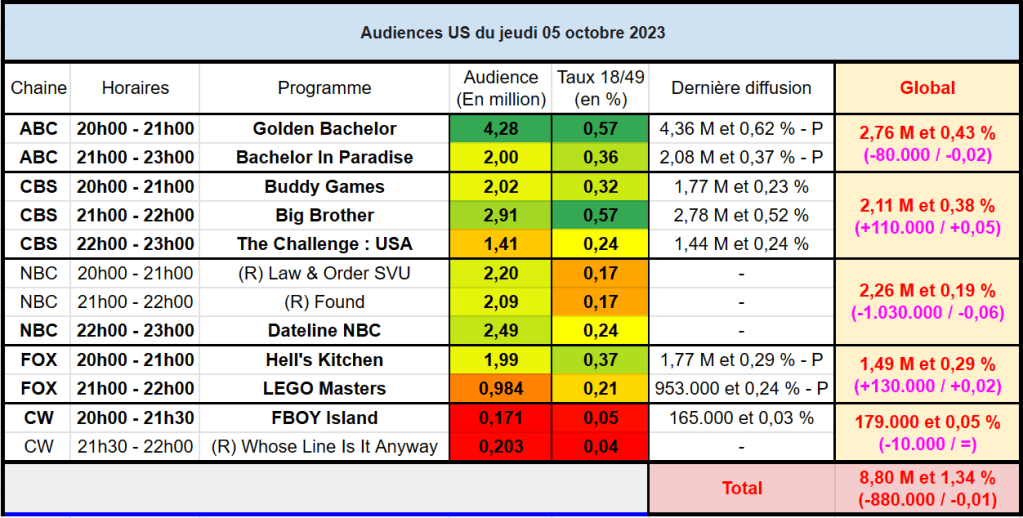 Audiences US du Jeudi 05.10.23 : Golden Bachelor confirme son succès. Buddy Game au plus haut de la saison. Bonne soirée pour NBC. Thomas Fusil Communiqués Audiences US 7 octobre 2023 1 Minute Voici les audiences de la soirée du 5 Octobre Partager : Partager sur X(ouvre dans une nouvelle fenêtre) X Partager sur Facebook(ouvre dans une nouvelle fenêtre) Facebook J’aime chargement… Similaire Publié par Thomas Fusil Voir tous les articles par Thomas Fusil Publié 7 octobre 2023