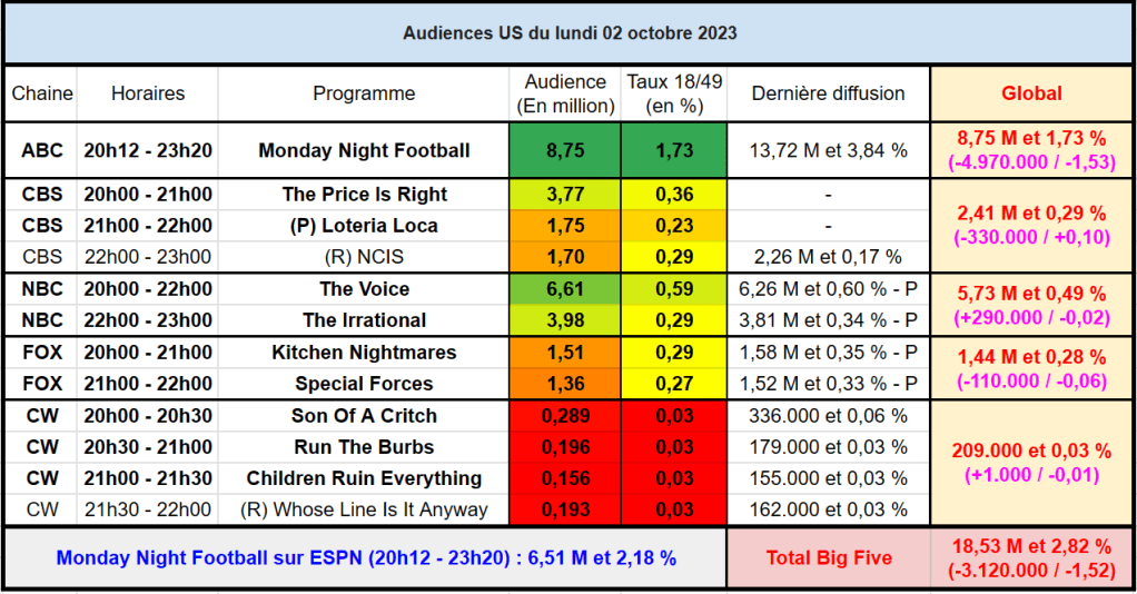Audiences US du Lundi 02.10.23 : MNF leader en forte baisse. Carton pour The Voice. The Irrational en hausse sur NBC. Flop pour Loteria Loca sur CBS. Thomas Fusil Communiqués Audiences US 7 octobre 20237 octobre 2023 1 Minute Voici les audiences de la soirée du 2 Octobre Partager : Partager sur X(ouvre dans une nouvelle fenêtre) X Partager sur Facebook(ouvre dans une nouvelle fenêtre) Facebook J’aime chargement… Similaire Publié par Thomas Fusil Voir tous les articles par Thomas Fusil Publié 7 octobre 20237 octobre 2023