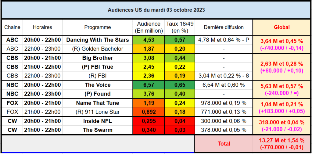 Audiences US du Mardi 03.10.23 : Excellent score pour The Voice. Lancement solide pour Found. DWTS en baisse. Thomas Fusil Communiqués Audiences US 7 octobre 2023 1 Minute Voici les audiences de la soirée du 3 Octobre Partager : Partager sur X(ouvre dans une nouvelle fenêtre) X Partager sur Facebook(ouvre dans une nouvelle fenêtre) Facebook J’aime chargement… Similaire Publié par Thomas Fusil Voir tous les articles par Thomas Fusil Publié 7 octobre 2023
