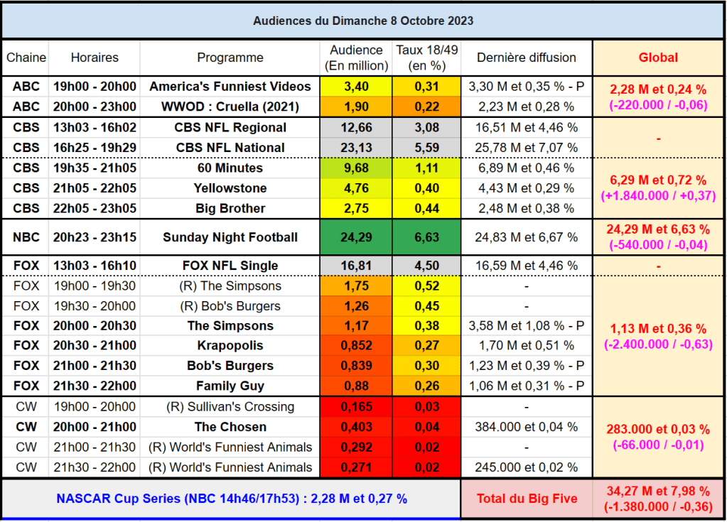 Audiences US du Dimanche 08.10.23 : Carton pour la NFL sur NBC. Excellent score pour 60 Minutes en version rallongée. Thomas Fusil Communiqués Audiences US 14 octobre 2023 1 Minute Voici les audiences de la soirée du 8 Octobre Partager : Partager sur X(ouvre dans une nouvelle fenêtre) X Partager sur Facebook(ouvre dans une nouvelle fenêtre) Facebook J’aime chargement… Similaire Publié par Thomas Fusil Voir tous les articles par Thomas Fusil Publié 14 octobre 2023
