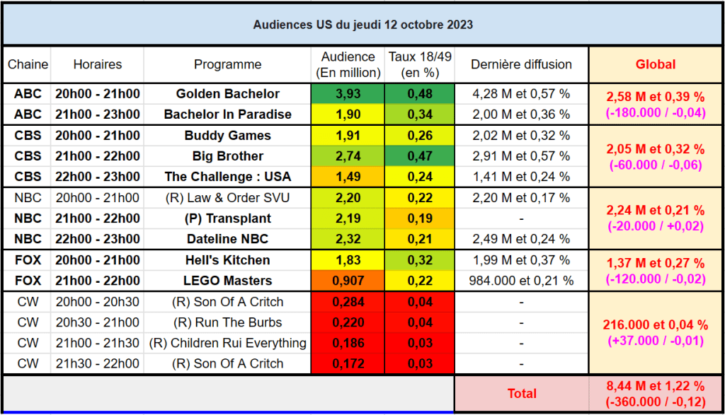 Audiences US du Jeudi 12.10.23 : Golden Bachelor leader en baisse. NBC s’en sort bien. LEGO Masters très faible sur FOX. Thomas Fusil Communiqués Audiences US 14 octobre 202314 octobre 2023 1 Minute Voici les audiences de la soirée du 12 octobre Partager : Partager sur X(ouvre dans une nouvelle fenêtre) X Partager sur Facebook(ouvre dans une nouvelle fenêtre) Facebook J’aime chargement… Similaire Publié par Thomas Fusil Voir tous les articles par Thomas Fusil Publié 14 octobre 202314 octobre 2023