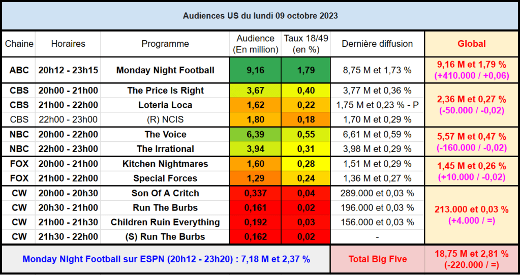 Audiences US du Lundi 09.10.23 : La NFL leader en hausse sur ABC. The Voice en baisse mais reste très bon. The Irrational stable. Thomas Fusil Communiqués Audiences US 14 octobre 202314 octobre 2023 1 Minute Voici les audiences de la soirée du 9 Octobre Partager : Partager sur X(ouvre dans une nouvelle fenêtre) X Partager sur Facebook(ouvre dans une nouvelle fenêtre) Facebook J’aime chargement… Similaire Publié par Thomas Fusil Voir tous les articles par Thomas Fusil Publié 14 octobre 202314 octobre 2023