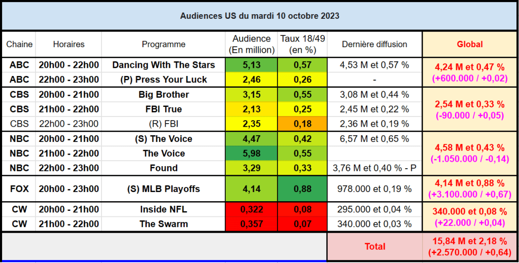 Audiences US du Mardi 10.10.23 : The Voice leader en nette baisse. Carton pour Dancing With The Stars sur ABC. FOX en forme avec le baseball. Thomas Fusil Communiqués Audiences US 14 octobre 202314 octobre 2023 1 Minute Voici les audiences de la soirée du 10 Octobre Partager : Partager sur X(ouvre dans une nouvelle fenêtre) X Partager sur Facebook(ouvre dans une nouvelle fenêtre) Facebook J’aime chargement… Similaire Publié par Thomas Fusil Voir tous les articles par Thomas Fusil Publié 14 octobre 202314 octobre 2023