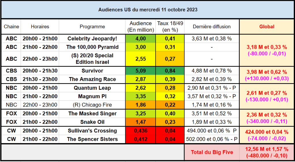 Audiences US du Mercredi 11.10.23 : Survivor puissant leader en hausse. Très bon score pour Celebrity Jeopardy. NBC et FOX en baisse. Thomas Fusil Communiqués Audiences US 14 octobre 202314 octobre 2023 1 Minute Voici les audiences de la soirée du 11 Octobre Partager : Partager sur X(ouvre dans une nouvelle fenêtre) X Partager sur Facebook(ouvre dans une nouvelle fenêtre) Facebook J’aime chargement… Similaire Publié par Thomas Fusil Voir tous les articles par Thomas Fusil Publié 14 octobre 202314 octobre 2023