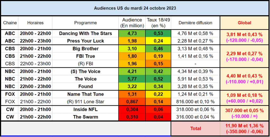 Audiences US du Mardi 24.10.23 : The Voice et DWTS dominent. Press Your Luck souffre sur ABC passant sous les 2M. Thomas Fusil Communiqués Audiences US 27 octobre 2023 1 Minute Voici les audiences de la soirée du 24 Octobre Partager : Partager sur X(ouvre dans une nouvelle fenêtre) X Partager sur Facebook(ouvre dans une nouvelle fenêtre) Facebook J’aime chargement… Similaire Publié par Thomas Fusil Voir tous les articles par Thomas Fusil Publié 27 octobre 2023