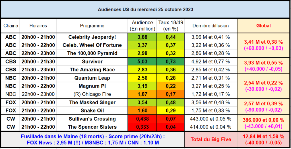 Audiences US du Mercredi 25.10.23 : Survivor puissant leader. Bon score pour Wheel Of Fortune et The Masked Singer. Thomas Fusil Communiqués Audiences US 27 octobre 202327 octobre 2023 1 Minute Voici les audiences de la soirée du 25 Octobre Partager : Partager sur X(ouvre dans une nouvelle fenêtre) X Partager sur Facebook(ouvre dans une nouvelle fenêtre) Facebook J’aime chargement… Similaire Publié par Thomas Fusil Voir tous les articles par Thomas Fusil Publié 27 octobre 202327 octobre 2023