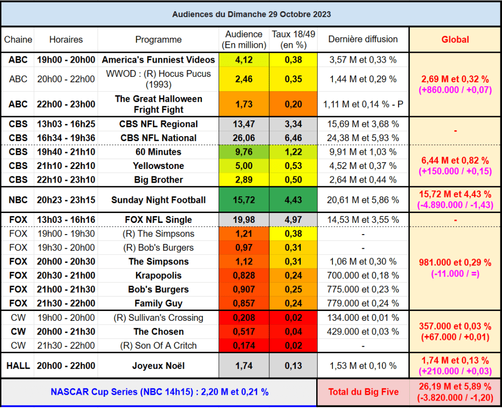 Audiences US du Dimanche 29.10.23 : Excellent score pour la NFL, 60 Minutes et Yellowstone sur CBS. NBC en forte baisse. Record pour AFV. Thomas Fusil Communiqués Audiences US 2 novembre 20232 novembre 2023 1 Minute Voici les audiences de la soirée du 29 Octobre Partager : Partager sur X(ouvre dans une nouvelle fenêtre) X Partager sur Facebook(ouvre dans une nouvelle fenêtre) Facebook J’aime chargement… Similaire Publié par Thomas Fusil Voir tous les articles par Thomas Fusil Publié 2 novembre 20232 novembre 2023
