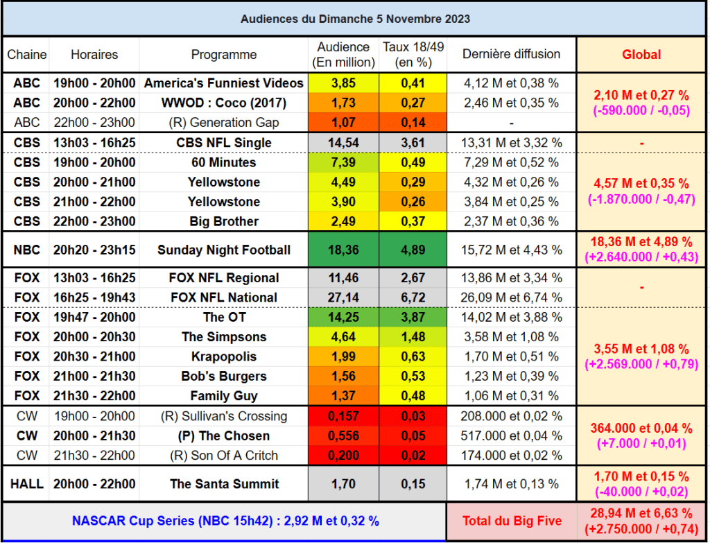 Audiences US du Dimanche 05.11.23 : NBC leader avec la NFL. Gros carton pour The Simpsons sur FOX. ABC en petite forme. Thomas Fusil Communiqués Audiences US 10 novembre 202310 novembre 2023 1 Minute Voici les audiences de la soirée du 5 Novembre Partager : Partager sur X(ouvre dans une nouvelle fenêtre) X Partager sur Facebook(ouvre dans une nouvelle fenêtre) Facebook J’aime chargement… Similaire Publié par Thomas Fusil Voir tous les articles par Thomas Fusil Publié 10 novembre 202310 novembre 2023