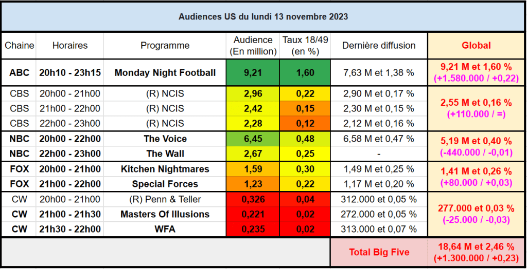 Audiences US du Lundi 13.11.23 : Monday Night Football très large leader en hausse. Les rediffusions de NCIS progressent. Thomas Fusil Communiqués Audiences US 15 novembre 2023 1 Minute Voici les audiences de la soirée du 13 Novembre Partager : Partager sur X(ouvre dans une nouvelle fenêtre) X Partager sur Facebook(ouvre dans une nouvelle fenêtre) Facebook J’aime chargement… Similaire Publié par Thomas Fusil Voir tous les articles par Thomas Fusil Publié 15 novembre 2023