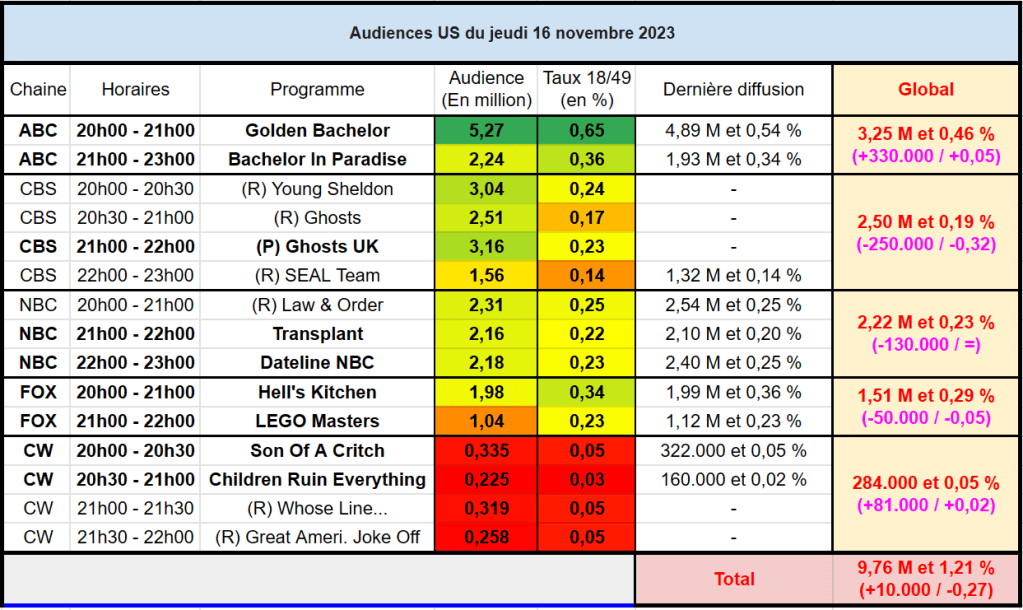 Audiences US du Jeudi 16.11.23 : Carton pour Golden Bachelor qui signe son record de saison, tout comme Bachelor In Paradise. Bon score pour Ghosts UK. LEGO Masterss faible.