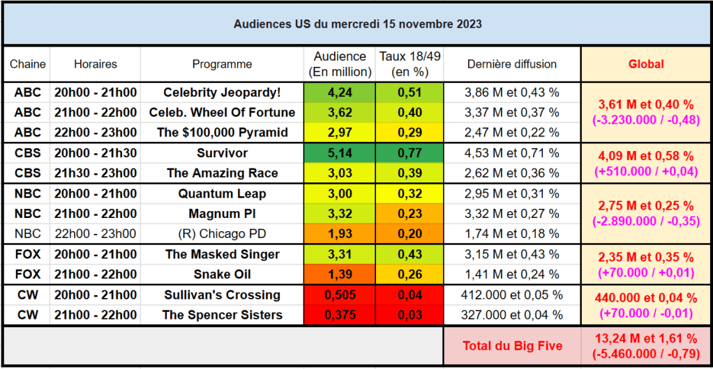 Audiences US du Mercredi 15.11.23 : Record de saison pour Celebrity Jeopardy, Celebrity Wheel Of Fortune, Amazing Race, Quantum Leap et Sullivan’s Crossing. Thomas Fusil Communiqués Audiences US 18 novembre 2023 1 Minute Voici les audiences de la soirée du 15 Novembre Partager : Partager sur X(ouvre dans une nouvelle fenêtre) X Partager sur Facebook(ouvre dans une nouvelle fenêtre) Facebook J’aime chargement… Similaire Publié par Thomas Fusil Voir tous les articles par Thomas Fusil Publié 18 novembre 2023