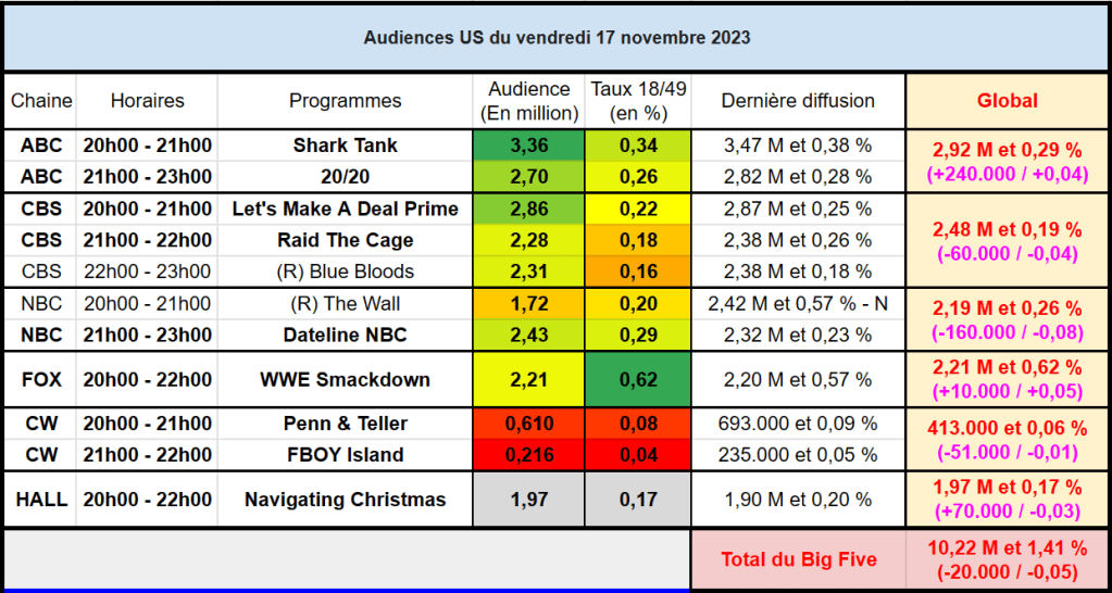 Audiences US du du Vendredi 17.11.23 : Shark Tank leader sur ABC. Dateline progresse. Très bon score pour Hallmark. Thomas Fusil Communiqués Audiences US 25 novembre 202325 novembre 2023 1 Minute Voici les audiences de la soirée du 17 Novembre Partager : Partager sur X(ouvre dans une nouvelle fenêtre) X Partager sur Facebook(ouvre dans une nouvelle fenêtre) Facebook J’aime chargement… Similaire Publié par Thomas Fusil Voir tous les articles par Thomas Fusil Publié 25 novembre 202325 novembre 2023