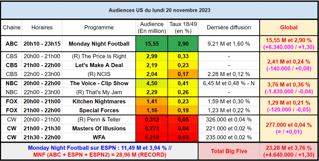 Audiences US du Lundi 20.11.23 : Record depuis 1996 pour un Monday Night Football en saison régulière ! ABC explose la concurrence. Toutes les autres chaines en baisse. Thomas Fusil Communiqués Audiences US 25 novembre 2023 1 Minute Voici les audiences de la soirée du 20 Novembre Partager : Partager sur X(ouvre dans une nouvelle fenêtre) X Partager sur Facebook(ouvre dans une nouvelle fenêtre) Facebook J’aime chargement… Similaire Publié par Thomas Fusil Voir tous les articles par Thomas Fusil Publié 25 novembre 2023