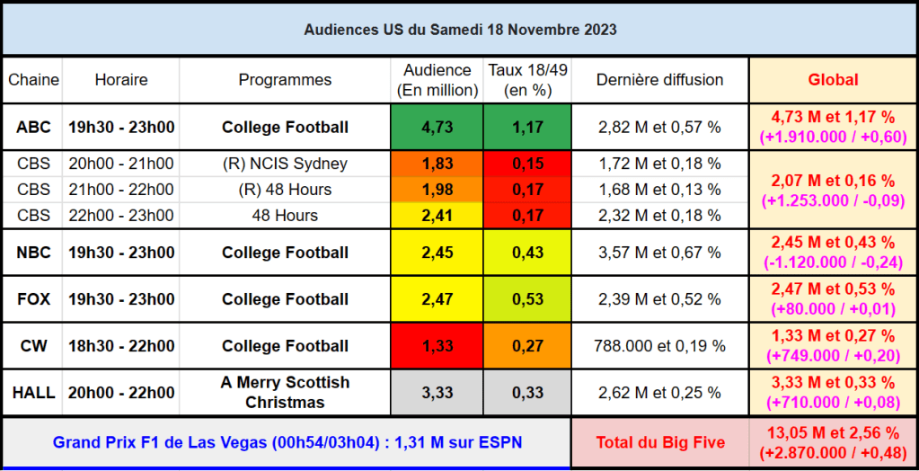Audiences US du Samedi 18.11.23 : ABC bon leader avec College Football. Hallmark et CW au plus haut de l’année. Thomas Fusil Communiqués Audiences US 25 novembre 2023 1 Minute Voici les audiences de la soirée du 18 Novembre Partager : Partager sur X(ouvre dans une nouvelle fenêtre) X Partager sur Facebook(ouvre dans une nouvelle fenêtre) Facebook J’aime chargement… Similaire Publié par Thomas Fusil Voir tous les articles par Thomas Fusil Publié 25 novembre 2023