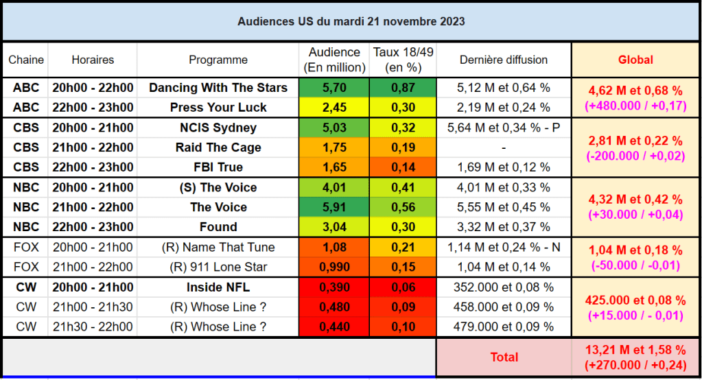 Audiences US du Mardi 21.11.23 : Carton pour DWTS qui signe son record de saison. The Voice en forte hausse. NCIS Sydney perd des téléspectateurs. Thomas Fusil Communiqués Audiences US 26 novembre 2023 1 Minute Voici les audiences de la soirée du 21 Novembre Partager : Partager sur X(ouvre dans une nouvelle fenêtre) X Partager sur Facebook(ouvre dans une nouvelle fenêtre) Facebook J’aime chargement… Similaire Publié par Thomas Fusil Voir tous les articles par Thomas Fusil Publié 26 novembre 2023