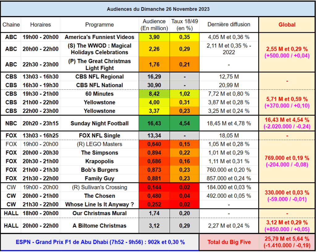 Audiences US du Dimanche 26.11.23 : Gros carton pour la NFL en fin d’après midi sur CBS. SNF en petite forme. Carton pour Hallmark. Thomas Fusil Communiqués Audiences US 2 décembre 2023 1 Minute Voici les audiences de la soirée du 26 Novembre Partager : Partager sur X(ouvre dans une nouvelle fenêtre) X Partager sur Facebook(ouvre dans une nouvelle fenêtre) Facebook J’aime chargement… Similaire Publié par Thomas Fusil Voir tous les articles par Thomas Fusil Publié 2 décembre 2023