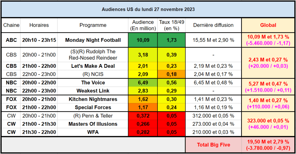 Audiences US du Lundi 27.11.23 : Monday Night Football large leader sur ABC. The Voice très solide. Joli score pour Weakest Link. Thomas Fusil Communiqués Audiences US 2 décembre 2023 1 Minute Voici les audiences de la soirée du 27 Novembre Partager : Partager sur X(ouvre dans une nouvelle fenêtre) X Partager sur Facebook(ouvre dans une nouvelle fenêtre) Facebook J’aime chargement… Similaire Publié par Thomas Fusil Voir tous les articles par Thomas Fusil Publié 2 décembre 2023