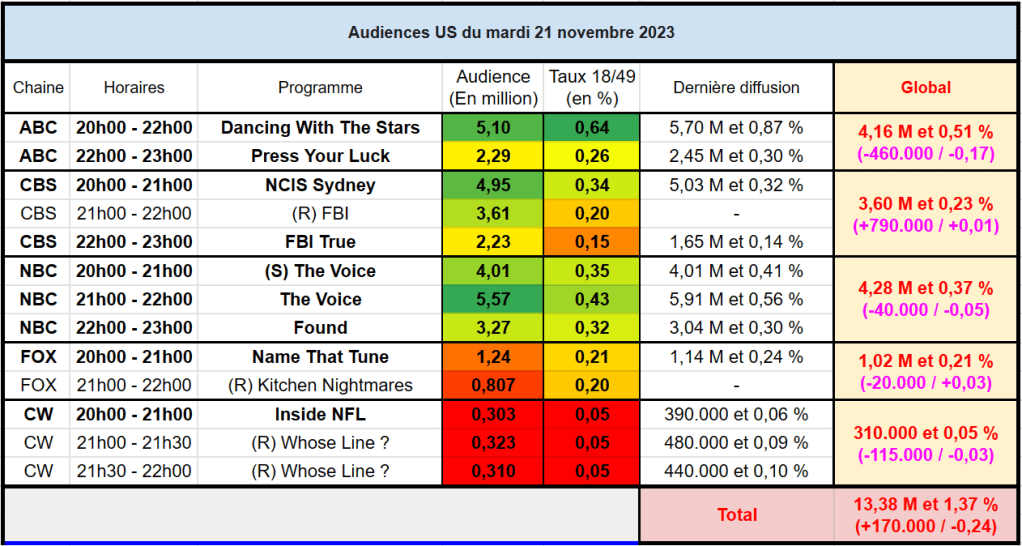 Audiences US du Mardi 28.11.23 : The Voice et DWTS en baisse. la rediffusion de FBI fait beaucoup de bien à CBS. Found progresse. Thomas Fusil Communiqués Audiences US 2 décembre 2023 1 Minute Voici les audiences de la soirée du 28 Novembre Partager : Partager sur X(ouvre dans une nouvelle fenêtre) X Partager sur Facebook(ouvre dans une nouvelle fenêtre) Facebook J’aime chargement… Similaire Publié par Thomas Fusil Voir tous les articles par Thomas Fusil Publié 2 décembre 2023