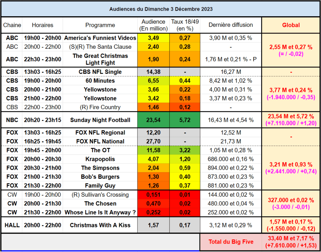 Audiences US du Dimanche 03.12.23 : Gros score pour Sunday Night Football sur NBC. Krapopolis au top en post-NFL. Hallmark s’effondre. Thomas Fusil Communiqués Audiences US 6 décembre 2023 1 Minute Voici les audiences US du 3 Décembre Partager : Partager sur X(ouvre dans une nouvelle fenêtre) X Partager sur Facebook(ouvre dans une nouvelle fenêtre) Facebook J’aime chargement… Similaire Publié par Thomas Fusil Voir tous les articles par Thomas Fusil Publié 6 décembre 2023