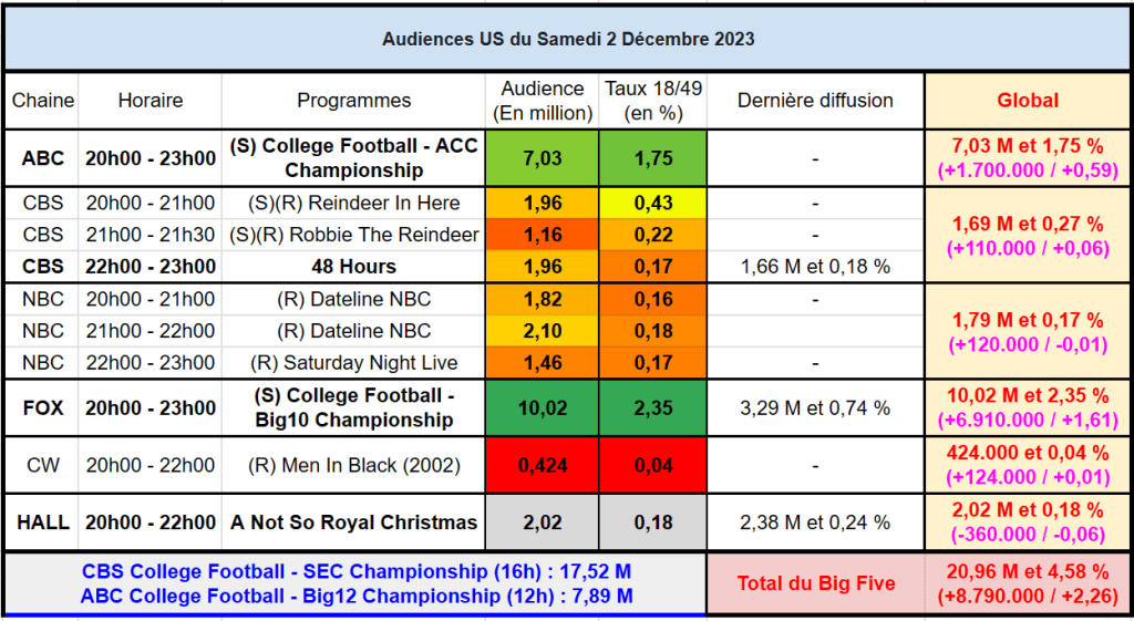 Audiences US du Samedi 02.12.23 : Carton pour College Football avec plus de 10M sur FOX et plus de 7M sur ABC. La concurrence souffre. Thomas Fusil Communiqués Audiences US 6 décembre 2023 1 Minute Voici les audiences de la soirée du 2 Décembre Partager : Partager sur X(ouvre dans une nouvelle fenêtre) X Partager sur Facebook(ouvre dans une nouvelle fenêtre) Facebook J’aime chargement… Similaire Publié par Thomas Fusil Voir tous les articles par Thomas Fusil Publié 6 décembre 2023