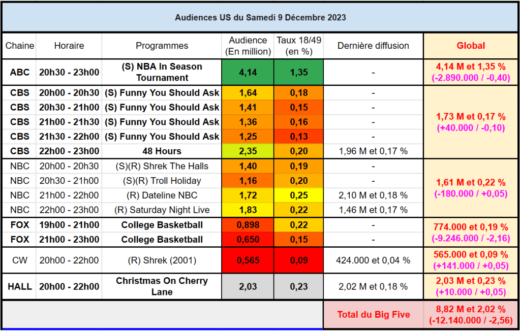 Audiences US du Samedi 09.12.23 : ABC net leader avec la NBA. Hallmark devant CBS, NBC et FOX. CW en belle forme avec son film. Thomas Fusil Communiqués Audiences US 13 décembre 2023 1 Minute Voici les audiences de la soirée du 9 Décembre Partager : Partager sur X(ouvre dans une nouvelle fenêtre) X Partager sur Facebook(ouvre dans une nouvelle fenêtre) Facebook J’aime chargement… Similaire Publié par Thomas Fusil Voir tous les articles par Thomas Fusil Publié 13 décembre 2023