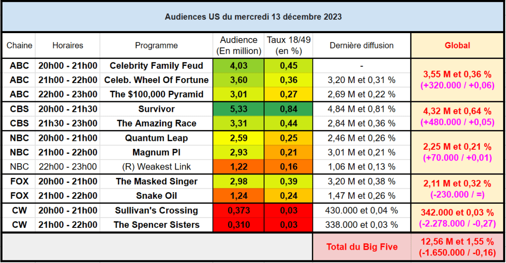 Audiences US du Mercredi 13.12.23 : Record pour les jeux de ABC, Survivor et The Amazing Race. The Masked Singer, Magnum PI et Sullivan’s Crossing au plus bas. Thomas Fusil Communiqués Audiences US 16 décembre 2023 1 Minute Voici les audiences de la soirée du 13 Décembre Partager : Partager sur X(ouvre dans une nouvelle fenêtre) X Partager sur Facebook(ouvre dans une nouvelle fenêtre) Facebook J’aime chargement… Similaire Publié par Thomas Fusil Voir tous les articles par Thomas Fusil Publié 16 décembre 2023