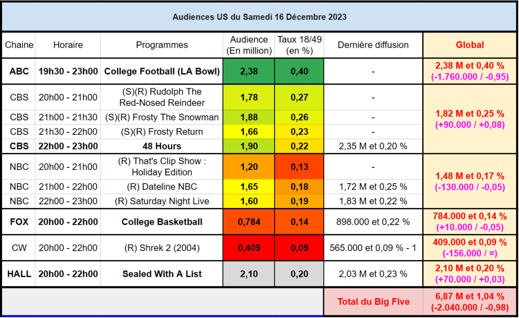 Audiences US du Samedi 16.12.23 : ABC petit leader à 2,4M. Hallmark devant CBS, NBC et FOX. Thomas Fusil Communiqués Audiences US 20 décembre 2023 1 Minute Voici les audiences de la soirée du 16 Décembre Partager : Partager sur X(ouvre dans une nouvelle fenêtre) X Partager sur Facebook(ouvre dans une nouvelle fenêtre) Facebook J’aime chargement… Similaire Publié par Thomas Fusil Voir tous les articles par Thomas Fusil Publié 20 décembre 2023