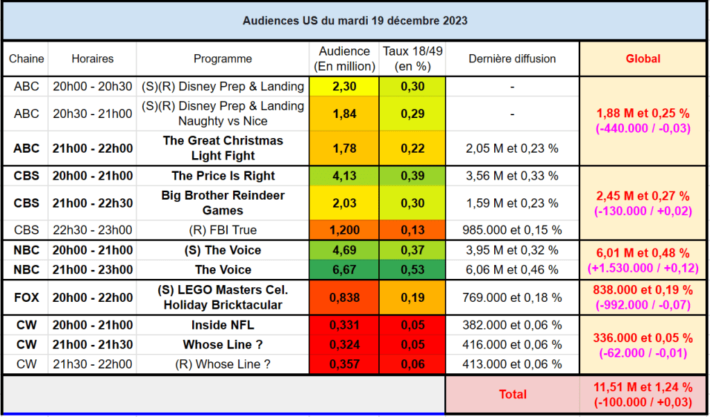 Audiences US du Mardi 19.12.23 : NBC au top avec la finale de The Voice. Très bon score pour The Price Is Right. ABC en petite forme. Thomas Fusil Communiqués Audiences US 23 décembre 2023 1 Minute Voici les audiences de la soirée du 19 Décembre Partager : Partager sur X(ouvre dans une nouvelle fenêtre) X Partager sur Facebook(ouvre dans une nouvelle fenêtre) Facebook J’aime chargement… Similaire Publié par Thomas Fusil Voir tous les articles par Thomas Fusil Publié 23 décembre 2023