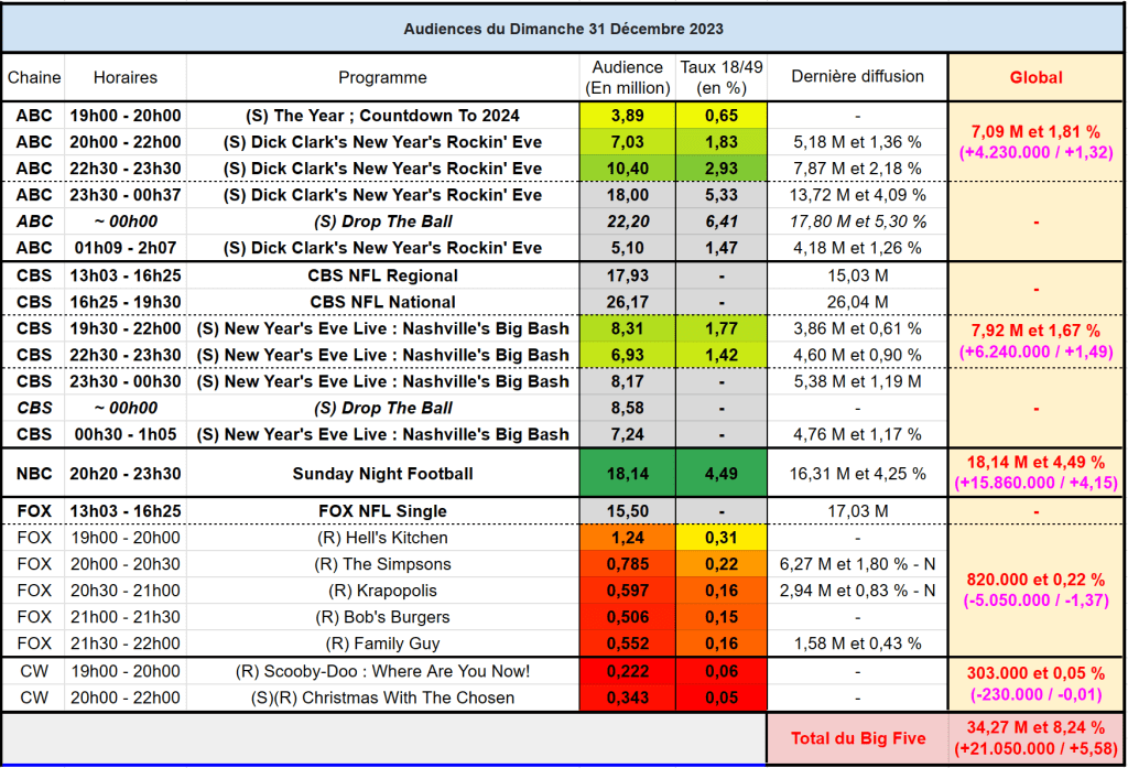 Ensuite, après la pause pour les JT locaux (de 22h à 22h30), ABC est largement en tête et continuera de fortement augmenter jusqu’à atteindre son pic à plus de 22M à 00h.