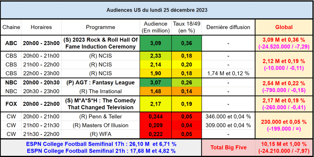 Audiences US du Lundi 01.01.24 : ABC domine la soirée. Lancement faiblard pour AGT Fantasy League sur NBC. Joli score pour le doc de FOX sur M*A*S*H Thomas Fusil Communiqués Audiences US 5 janvier 2024 1 Minute Voici les audiences de la soirée du 1er Janvier Partager : Partager sur X(ouvre dans une nouvelle fenêtre) X Partager sur Facebook(ouvre dans une nouvelle fenêtre) Facebook J’aime chargement… Similaire Publié par Thomas Fusil Voir tous les articles par Thomas Fusil Publié 5 janvier 2024