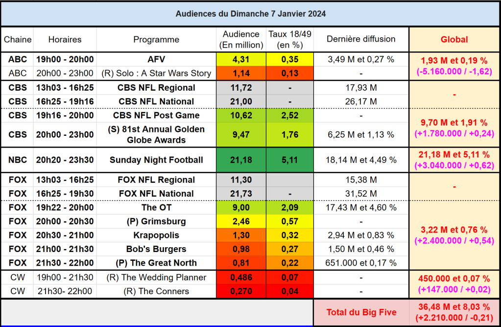 Audiences US du Dimanche 07.01.24 : NBC puissant leader. Carton pour les Golben Globes sur CBS, portés par la NFL. ABC faible. Thomas Fusil Communiqués Audiences US 10 janvier 2024 1 Minute Voici les audiences de la soirée du 7 Janvier Partager : Partager sur X(ouvre dans une nouvelle fenêtre) X Partager sur Facebook(ouvre dans une nouvelle fenêtre) Facebook J’aime chargement… Similaire Publié par Thomas Fusil Voir tous les articles par Thomas Fusil Publié 10 janvier 2024