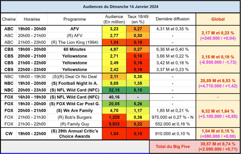 Audiences US du Dimanche 14.01.23 : NBC au plus haut avec la NFL au dessus des 32M. FOX au top avec l’après match NFL et We Are Family. CW au dessus du million. Thomas Fusil Communiqués Audiences US 20 janvier 2024 1 Minute Voici les audiences de la soirée du 14 Janvier Partager : Partager sur X(ouvre dans une nouvelle fenêtre) X Partager sur Facebook(ouvre dans une nouvelle fenêtre) Facebook J’aime chargement… Similaire Publié par Thomas Fusil Voir tous les articles par Thomas Fusil Publié 20 janvier 2024