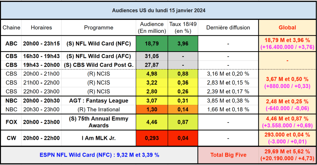 Audiences US du Lundi 15.01.24 : ABC large leader avec la NFL. NCIS boosté par la NFL sur CBS. Les Emmys Awards au plus bas sur FOX. Thomas Fusil Communiqués Audiences US 20 janvier 2024 1 Minute Voici les audiences de la soirée du 1 Janvier Partager : Partager sur X(ouvre dans une nouvelle fenêtre) X Partager sur Facebook(ouvre dans une nouvelle fenêtre) Facebook J’aime chargement… Similaire Publié par Thomas Fusil Voir tous les articles par Thomas Fusil Publié 20 janvier 2024