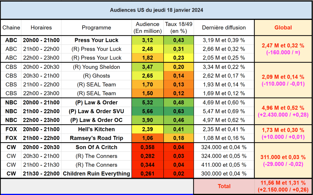 Audiences US du Jeudi 18.01.24 : NBC large leader avec les très bons retours de Law & Order SVU et Law & Order. La rediff de Young Sheldon en hausse. Thomas Fusil Communiqués Audiences US 24 janvier 2024 1 Minute Voici les audiences de la soirée du 18 Janvier Partager : Partager sur X(ouvre dans une nouvelle fenêtre) X Partager sur Facebook(ouvre dans une nouvelle fenêtre) Facebook J’aime chargement… Similaire Publié par Thomas Fusil Voir tous les articles par Thomas Fusil Publié 24 janvier 2024