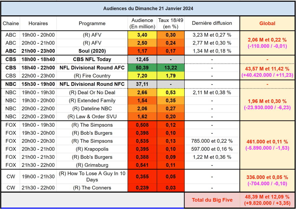 Audiences US du Dimanche 21.01.24 : CBS explose tout en dépassant les 50M et signe la meilleure audience historique pour un match de NFL Divisional Round. La concurrence souffre.