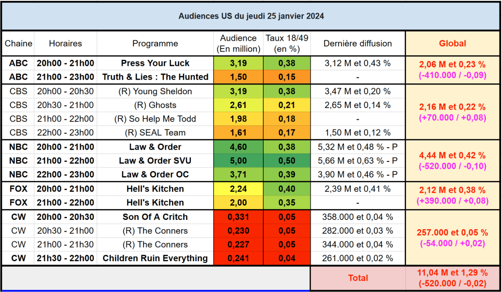 Audiences US du Jeudi 25.01.24 : Law & Order SVU domine sur les deux critères. Truth and & Lies faible sur ABC. Hell’s Kitchen bon sur cible pour son final. Thomas Fusil Communiqués Audiences US 27 janvier 2024 1 Minute Voici les audiences de la soirée du 25 Janvier Partager : Partager sur X(ouvre dans une nouvelle fenêtre) X Partager sur Facebook(ouvre dans une nouvelle fenêtre) Facebook J’aime chargement… Similaire Publié par Thomas Fusil Voir tous les articles par Thomas Fusil Publié 27 janvier 2024