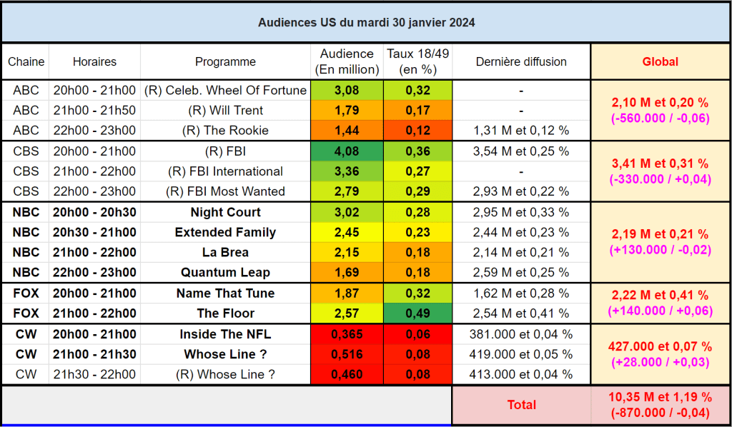 Audiences US du Mardi 30.01.24 : La rediffusion de FBI dépasse les 4M sur CBS. Night Court en légère hausse. Quantum Leap faible sur NBC. Thomas Fusil Communiqués Audiences US 3 février 2024 1 Minute Voici les audiences de la soirée du 30 Janvier Partager : Partager sur X(ouvre dans une nouvelle fenêtre) X Partager sur Facebook(ouvre dans une nouvelle fenêtre) Facebook J’aime chargement… Similaire Publié par Thomas Fusil Voir tous les articles par Thomas Fusil Publié 3 février 2024