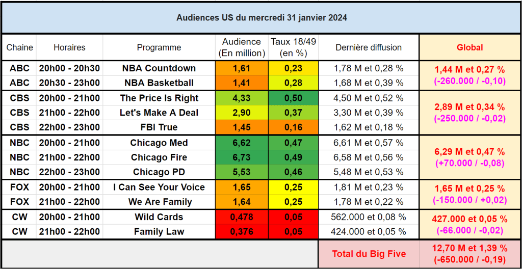 Audiences US du Mercredi 31.01.24 : NBC domine largement la concurrence avec le One Chicago. Les divertissements de FOX et la NBA faibles. Thomas Fusil Communiqués Audiences US 3 février 2024 1 Minute Voici les audiences de la soirée du 31 Janvier Partager : Partager sur X(ouvre dans une nouvelle fenêtre) X Partager sur Facebook(ouvre dans une nouvelle fenêtre) Facebook J’aime chargement… Similaire Publié par Thomas Fusil Voir tous les articles par Thomas Fusil Publié 3 février 2024