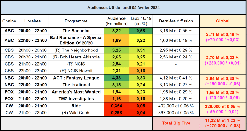 Audiences US du Lundi 05.02.24 : The Bachelor progresse. AGT Fantasy League en forme. la rediff de The Neighborhood solide. Thomas Fusil Communiqués Audiences US 7 février 20247 février 2024 1 Minute Voici les audiences de la soirée du 5 Février Partager : Partager sur X(ouvre dans une nouvelle fenêtre) X Partager sur Facebook(ouvre dans une nouvelle fenêtre) Facebook J’aime chargement… Similaire Publié par Thomas Fusil Voir tous les articles par Thomas Fusil Publié 7 février 20247 février 2024