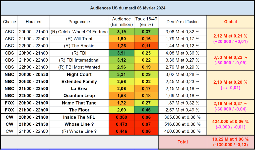 Audiences US du Mardi 06.02.24 : CBS domine la soirée avec les rediffusions de la franchise FBI. Quantum Leap en souffrance sur NBC. Thomas Fusil Communiqués Audiences US 10 février 2024 1 Minute Voici les audiences de la soirée du 6 Février Partager : Partager sur X(ouvre dans une nouvelle fenêtre) X Partager sur Facebook(ouvre dans une nouvelle fenêtre) Facebook J’aime chargement… Similaire Publié par Thomas Fusil Voir tous les articles par Thomas Fusil Publié 10 février 2024