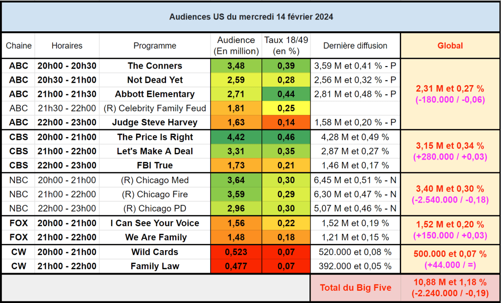 Audiences US du Mercredi 14.02.24 : The Price Is Right leader sur CBS. Judge Steve Harvey en grande souffrance sur ABC. Record historique pour Family Law. Thomas Fusil Communiqués Audiences US 17 février 2024 1 Minute Voici les audiences de la soirée du 14 Février Partager : Partager sur X(ouvre dans une nouvelle fenêtre) X Partager sur Facebook(ouvre dans une nouvelle fenêtre) Facebook J’aime chargement… Similaire Publié par Thomas Fusil Voir tous les articles par Thomas Fusil Publié 17 février 2024