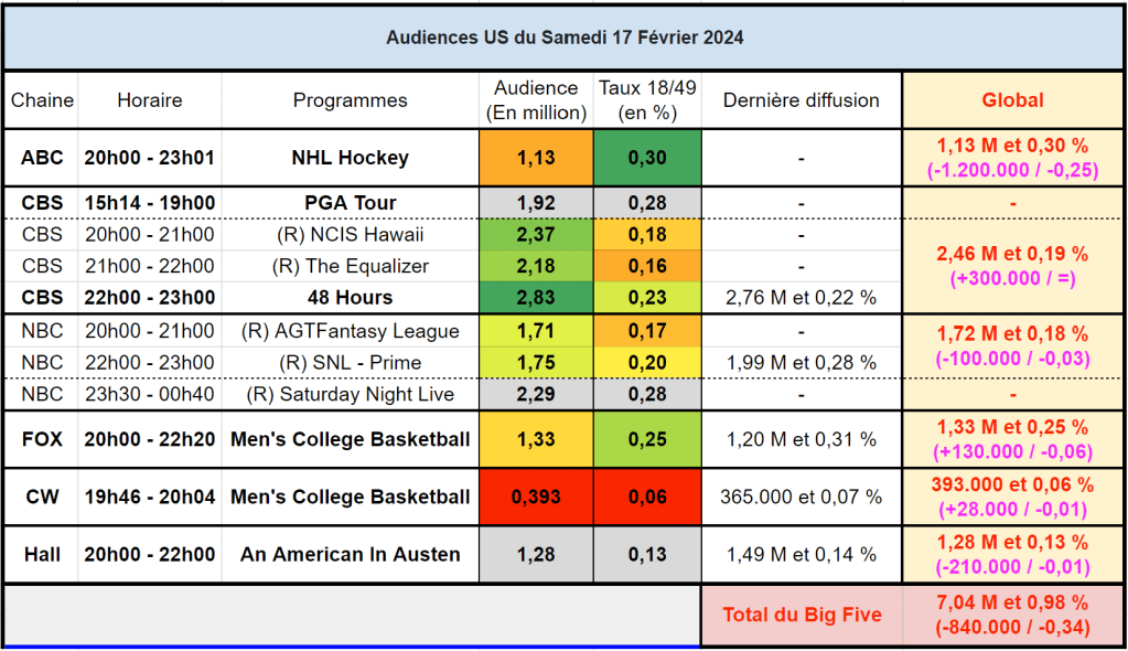 Audiences US du Samedi 17.02.24 : 48 Hours au plus haut depuis Mai 2023. Petit score pour le hockey sur ABC, mais qui domine sur cible. Thomas Fusil Communiqués Audiences US 24 février 2024 1 Minute Voici les audiences de la soirée du 17 Février Partager : Partager sur X(ouvre dans une nouvelle fenêtre) X Partager sur Facebook(ouvre dans une nouvelle fenêtre) Facebook J’aime chargement… Similaire Publié par Thomas Fusil Voir tous les articles par Thomas Fusil Publié 24 février 2024