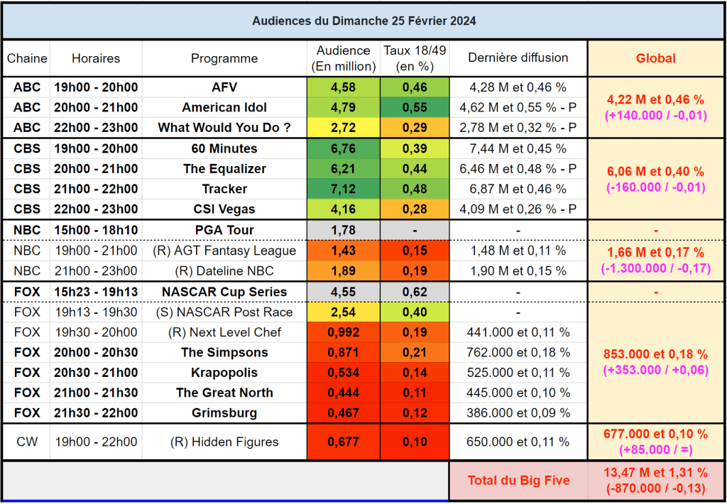 Audiences US du Dimanche 25.02.24 : Carton pour Tracker qui dépasse les 7M. CSI Vegas au plus haut depuis 2021. NBC faible. FOX en souffrance. Thomas Fusil Communiqués Audiences US 28 février 2024 1 Minute Voici les audiences de la soirée du 25 Février Partager : Partager sur X(ouvre dans une nouvelle fenêtre) X Partager sur Facebook(ouvre dans une nouvelle fenêtre) Facebook J’aime chargement… Similaire Publié par Thomas Fusil Voir tous les articles par Thomas Fusil Publié 28 février 2024