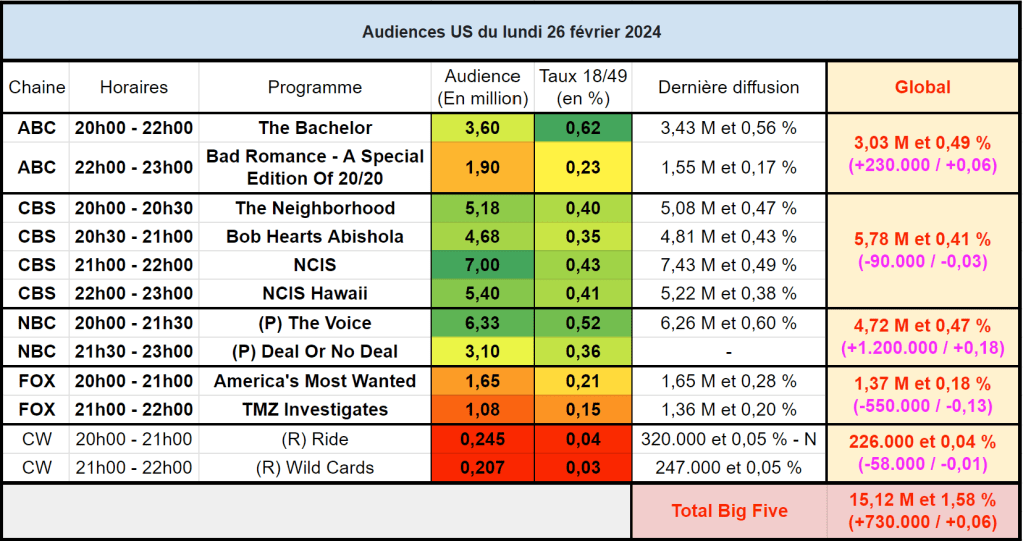 Audiences US du Lundi 26.02.24 : NCIS toujours leader sur CBS. NCIS Hawaii en forme. Retour solide pour The Voice. The Bachelor signe un nouveau record. Thomas Fusil Communiqués Audiences US 29 février 2024 1 Minute Voici les audiences de la soirée du 26 Février Partager : Partager sur X(ouvre dans une nouvelle fenêtre) X Partager sur Facebook(ouvre dans une nouvelle fenêtre) Facebook J’aime chargement… Similaire Publié par Thomas Fusil Voir tous les articles par Thomas Fusil Publié 29 février 2024