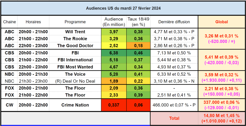 Audiences US du Mardi 27.02.24 : FBI leader en forte baisse. Will Trent, The Rookie et la franchise FBI en baisse. The Good Doctor faible sur cible. Thomas Fusil Communiqués Audiences US 29 février 202429 février 2024 1 Minute Voici les audiences de la soirée du 27 Février Partager : Partager sur X(ouvre dans une nouvelle fenêtre) X Partager sur Facebook(ouvre dans une nouvelle fenêtre) Facebook J’aime chargement… Similaire Publié par Thomas Fusil Voir tous les articles par Thomas Fusil Publié 29 février 202429 février 2024