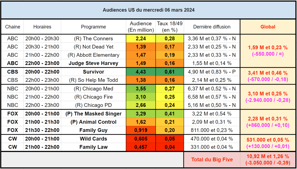Audiences US du Mercredi 06.03.24 : Survivor leader en baisse. Retour correct pour The Masked Singer. ABC faible. Record pour Wild Cards sur CW. Thomas Fusil Communiqués Audiences US 10 mars 2024 1 Minute Voici les audiences de la soirée du 6 Mars Partager : Partager sur X(ouvre dans une nouvelle fenêtre) X Partager sur Facebook(ouvre dans une nouvelle fenêtre) Facebook J’aime chargement… Similaire Publié par Thomas Fusil Voir tous les articles par Thomas Fusil Publié 10 mars 2024