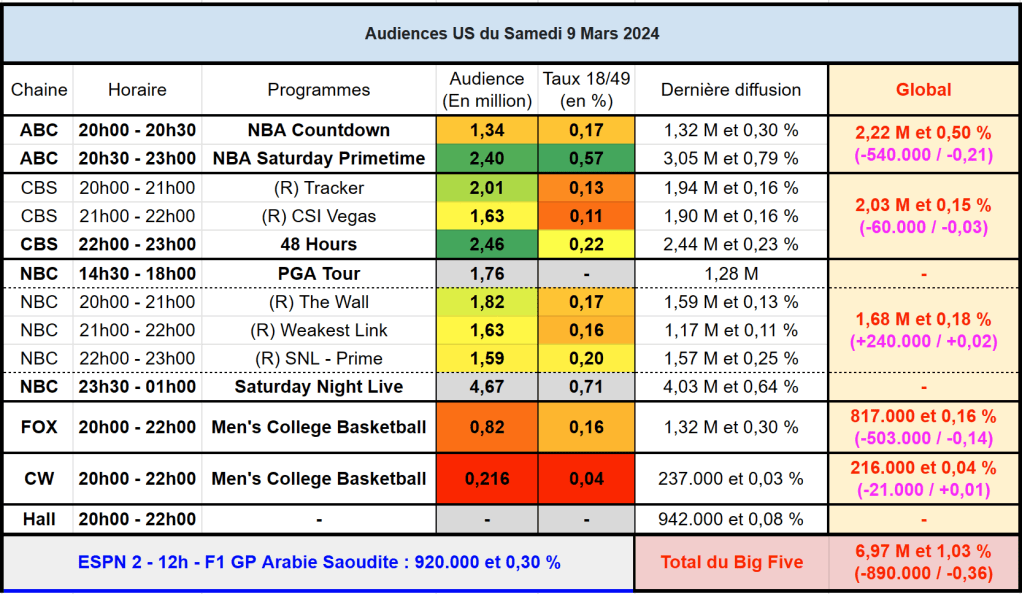 Audiences US du Samedi 09.03.24 : Saturday Night Live en forte hausse à 23h30 sur NBC. En prime, 48 Hours et la NBA dominent. Thomas Fusil Communiqués Audiences US 13 mars 2024 1 Minute Voici les audiences de la soirée du 9 Mars Partager : Partager sur X(ouvre dans une nouvelle fenêtre) X Partager sur Facebook(ouvre dans une nouvelle fenêtre) Facebook J’aime chargement… Similaire Publié par Thomas Fusil Voir tous les articles par Thomas Fusil Publié 13 mars 2024