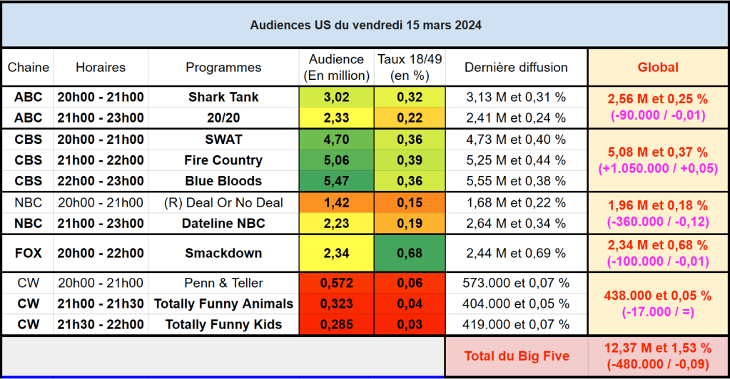 Audiences US du Vendredi 15.03.24 : CBS large leader avec SWAT, Fire Country et Blue Bloods. 20/20 et Dateline en petite forme. Thomas Fusil Communiqués Audiences US 19 mars 2024 1 Minute Voici les audiences de la soirée du 15 Mars Partager : Partager sur X(ouvre dans une nouvelle fenêtre) X Partager sur Facebook(ouvre dans une nouvelle fenêtre) Facebook J’aime chargement… Similaire Publié par Thomas Fusil Voir tous les articles par Thomas Fusil Publié 19 mars 2024