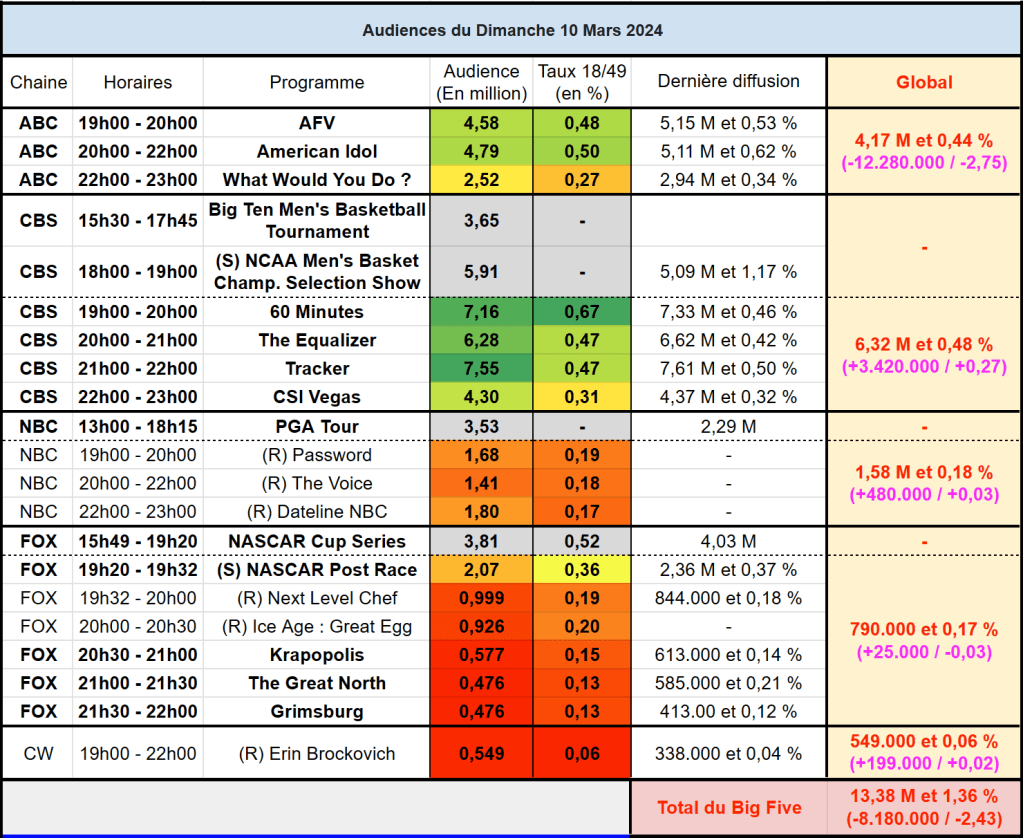 Audiences US du Dimanche 17.03.24 : Tracker puissant leader sur CBS. 60 Minutes, The Equalizer et CSI Vegas solides. American Idol en baisse. Thomas Fusil Communiqués Audiences US 20 mars 2024 1 Minute Voici les audiences de la soirée du 17 Mars Partager : Partager sur X(ouvre dans une nouvelle fenêtre) X Partager sur Facebook(ouvre dans une nouvelle fenêtre) Facebook J’aime chargement… Similaire Publié par Thomas Fusil Voir tous les articles par Thomas Fusil Publié 20 mars 2024