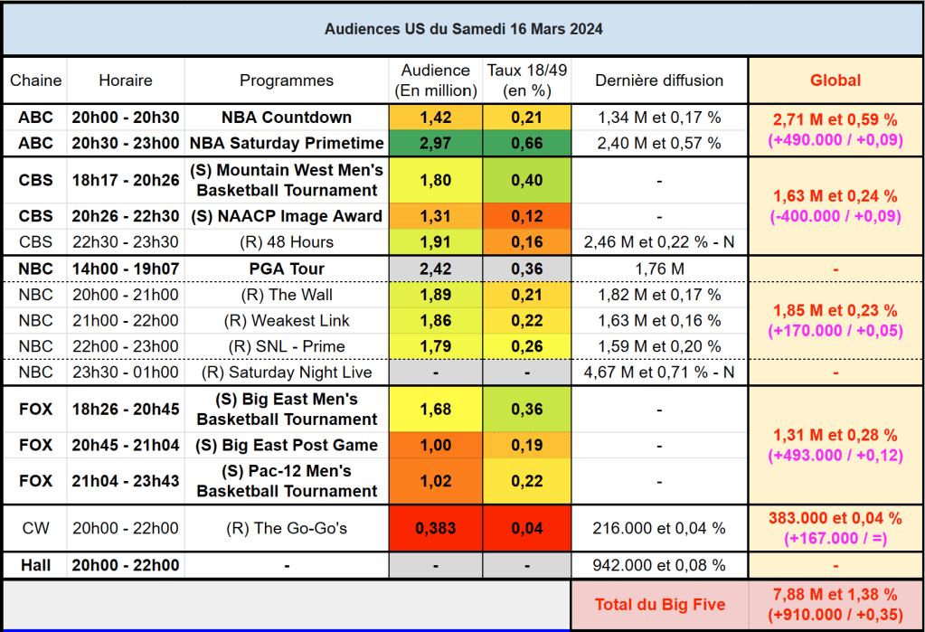 Audiences US du Samedi 16.03.24 : La NBA domine facilement sur ABC. NAACP Image Awards très faible sur CBS. NBC s’en sort bien. Thomas Fusil Communiqués Audiences US 20 mars 202420 mars 2024 1 Minute Voici les audiences de la soirée du 16 Mars Partager : Partager sur X(ouvre dans une nouvelle fenêtre) X Partager sur Facebook(ouvre dans une nouvelle fenêtre) Facebook J’aime chargement… Similaire Publié par Thomas Fusil Voir tous les articles par Thomas Fusil Publié 20 mars 202420 mars 2024
